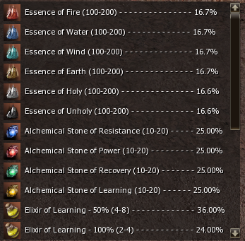 Elixir of Learning 50/100/200% - An alchemical elixir that increases acquired EXP from monsters by 50/100/200% for 20 minutes. Re-use delay is 30 seconds.