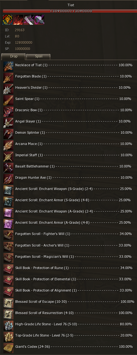 Necklace of Tiat - new S-Grade epic item. MP +42, Resistance to Mental/Hold attacks +10%; Mental/Hold attack rate +10%. Increases heal amount by 8%. Magic Critical Rate +25%.